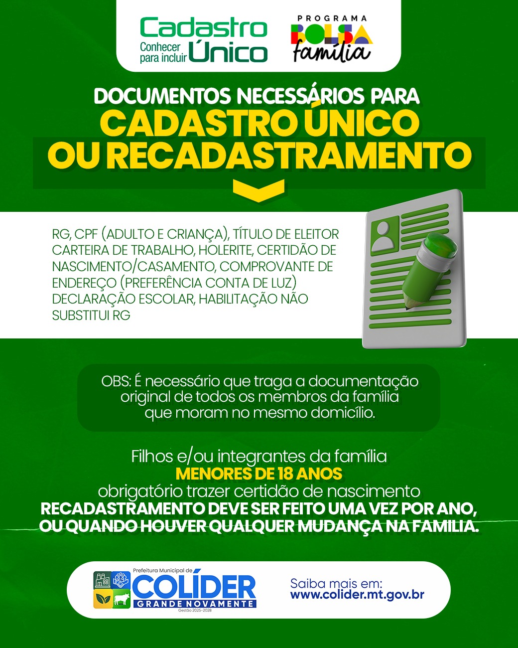 A prefeitura municipal de Colíder,esta comprometida em auxiliar a população com os serviços de atualização, cadastramento e recadastramento, para isso você pode ir até o CRAS que fica localizado na Estrada Planalto, N°-105, Torre, esperamos por você.