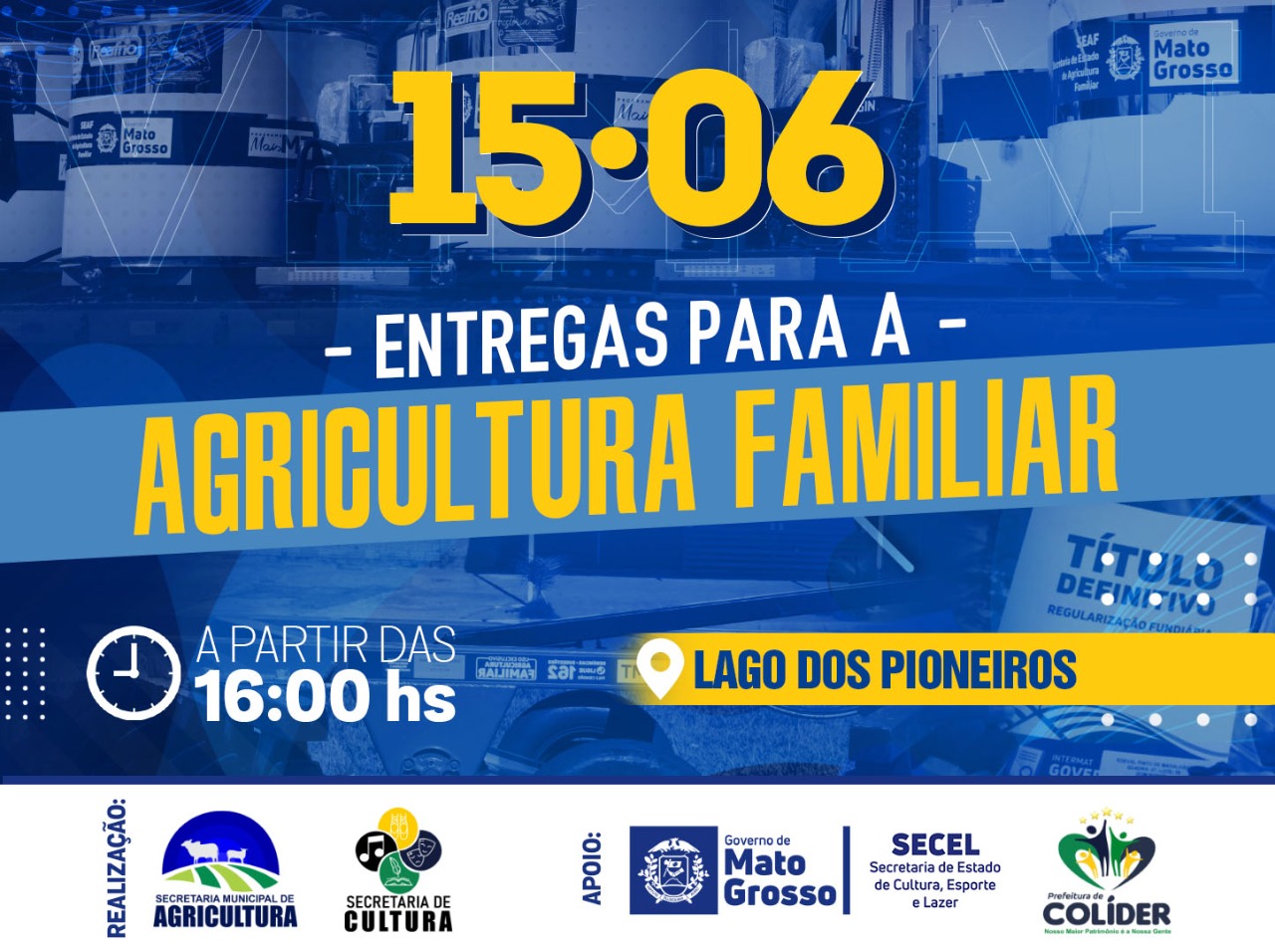 A agricultura familiar estará recebendo várias entregas como: títulos definitivos de propriedades rurais, doze resfriadosres de leite para famílias beneficiadas, grades niveladoras, plantadeiras, ensiladeiras e calcário para os produtores rurais.