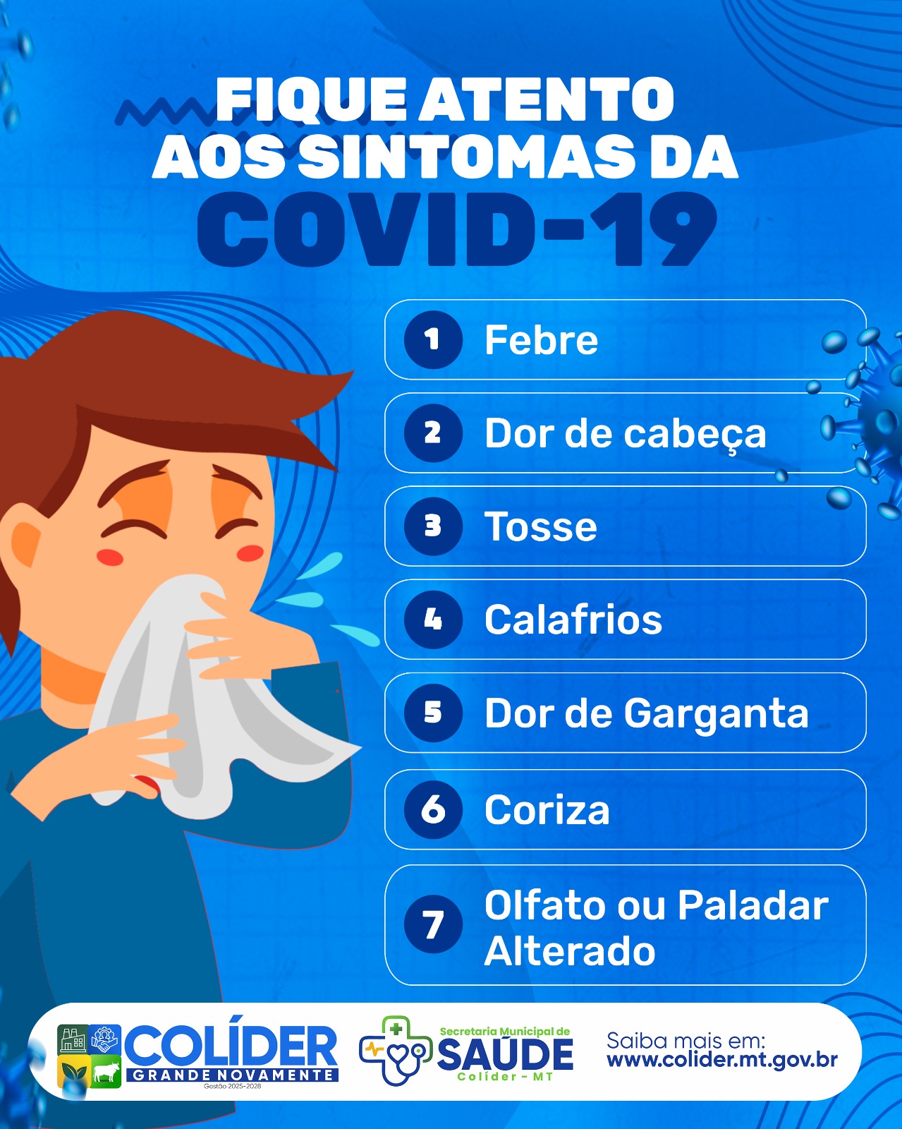 A Prefeitura Municipal de Colíder por meio da Secretaria Municipal de Saúde vem alertar a população para intensificação das ações de prevenção e controle da Covid-19 e outros vírus respiratórios, visto que estamos na estação climática chuvosa na região, em que há o aumento significativo do número de casos de síndrome Gripal (SG) e Síndrome Respiratória Aguda Grave (SRAG).