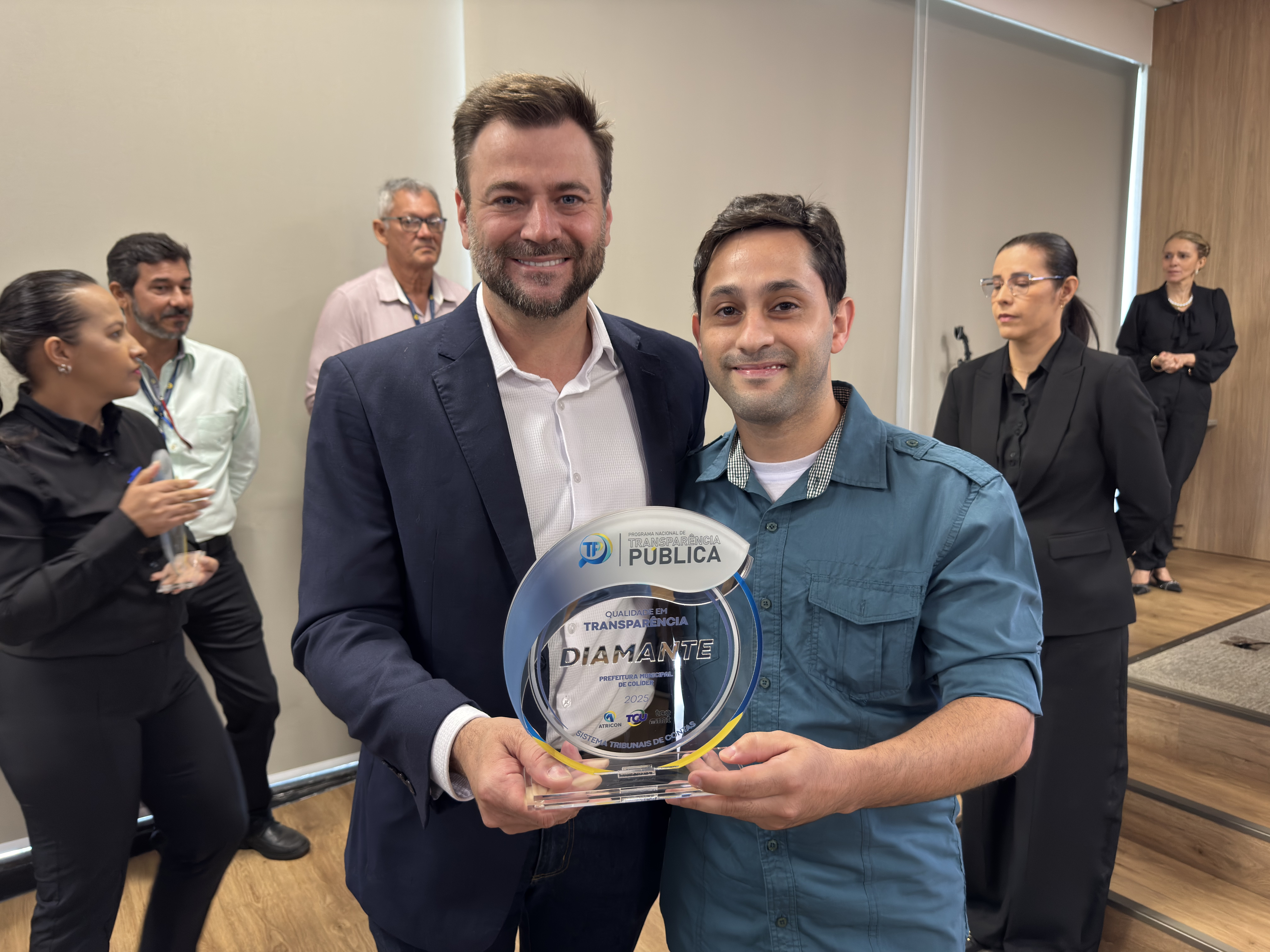 A Prefeitura de Colíder recebeu o Selo Diamante de transparência pública do Tribunal de Contas de Mato Grosso (TCE-MT) e da Associação dos Membros dos Tribunais de Contas do Brasil (Atricon). O certificado foi entregue ao prefeito Rodrigo Benassi nesta quarta-feira (10.12) em solenidade realizada em Cuiabá. O reconhecimento integra o Programa Nacional de Transparência Pública (PNTP), que avaliou portais eletrônicos dos poderes Executivo e Legislativo municipais e estadual. O controlador interno Derrick Smith esteve presente com o prefeito na entrega do prêmio.