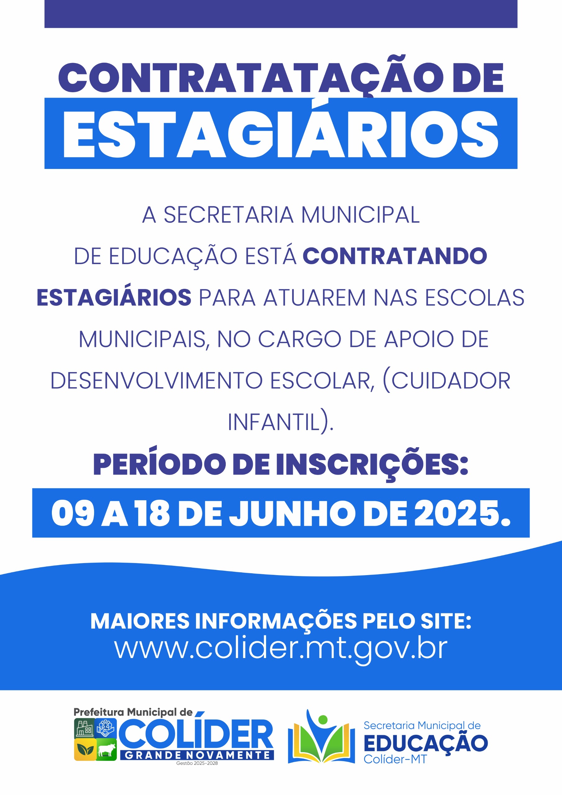 A Prefeitura de Colíder, por meio da Secretaria Municipal de Educação, anuncia a abertura do período de inscrições para contratação de estagiários que atuarão nas escolas da rede municipal no cargo de Apoio de Desenvolvimento Escolar (Cuidador Infantil). A ação é voltada a estudantes de cursos superiores e tem como objetivo reforçar a equipe escolar, ao mesmo tempo em que incentiva a realização de estágios dentro do próprio município.